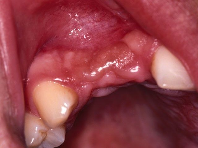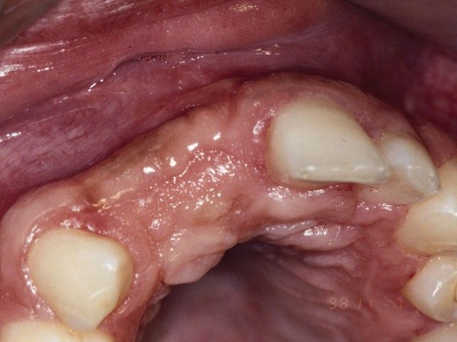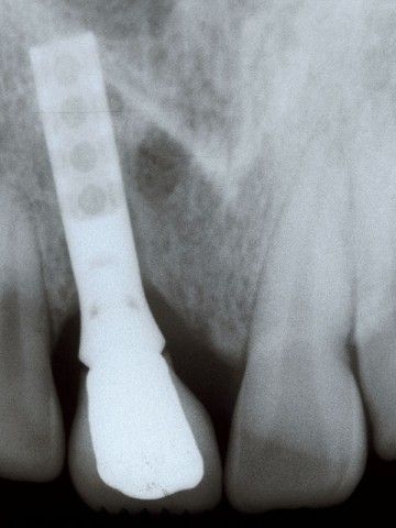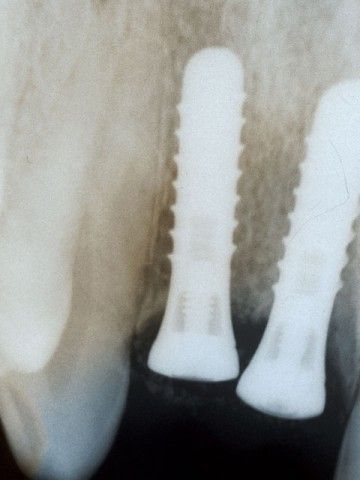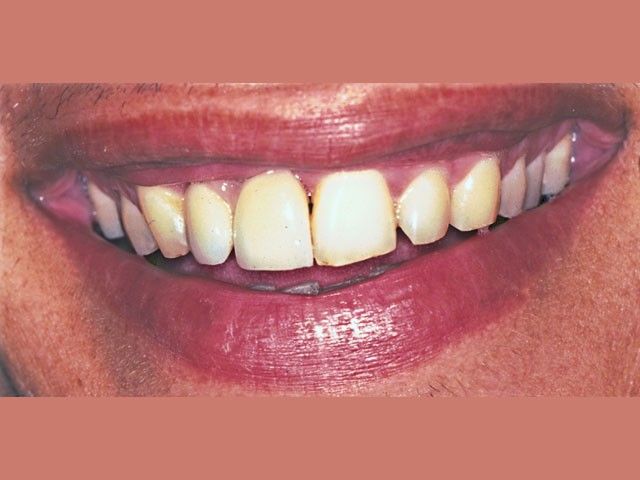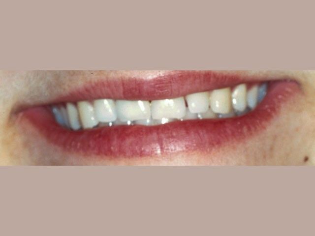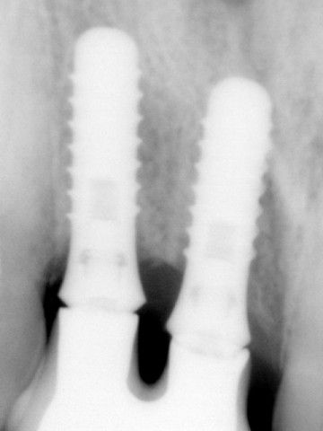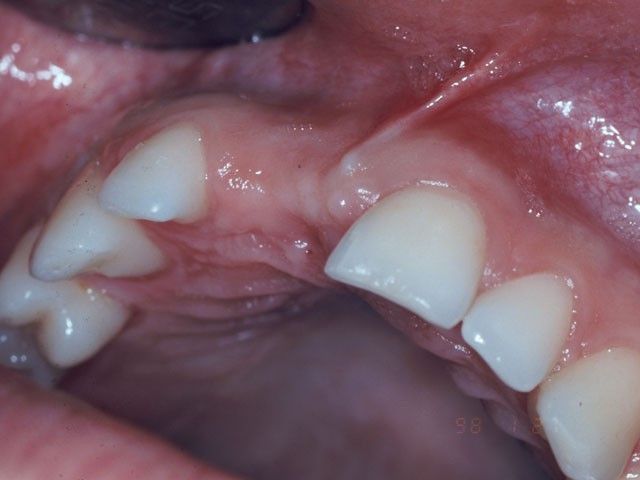 Στη φωτογραφία η αποκατάσταση ενός άνω κεντρικού τομέα το 1997 με αισθητικά υλικά και εμφυτευματική στήριξη.